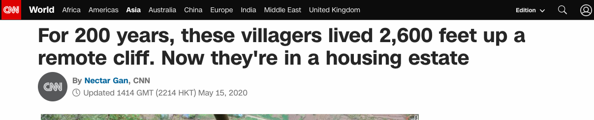 美国有线电视新闻网(CNN)15日发表文章《200年以来,这些村民都住在2600英尺高的悬崖上。现在他们要搬入新房了》。报道评论称,对村民们来说,“云雾中的生活已经结束了”。